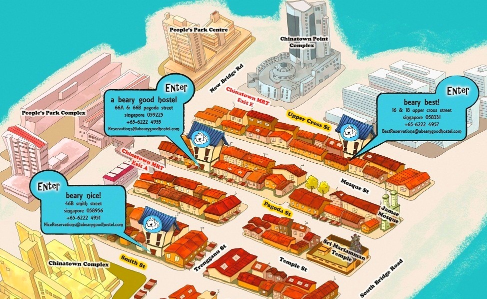 The Beary Nice hostel is located very close to Chinatown MRT and is just a few minutes away to the nightly food street, the People’s Park Complex, Sri Mariamman Temple (Hindu) and Jamae Mosque (Islam).