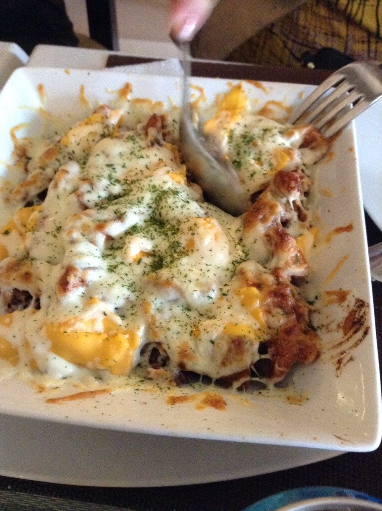 We had individual orders and had a rather large portion of romaine lettuce salad with adobo flakes and quinoa. I think this was the first time I’ve had those tiny things! We ordered three different kinds of brown rice topped with melted cheese (yum!). I’ve tasted all three (BBQ chicken, seafood, and beef) and we all agreed, the BBQ chicken tops the list!