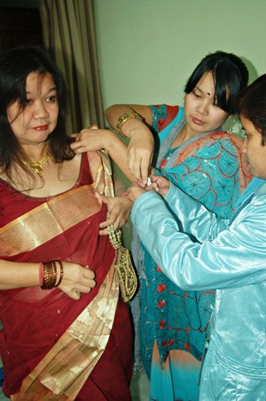 After shopping, we returned to the relatively warmer sanctuary of Tito Ben’s home with the comfort of Tea and Coffee, unlimited! 🙂 We watched some movies too, including the very long Bodyguard (without subtitles!) starring Salman Khan and Kareena Kapoor! I’ve seen it before already so I was kinda explaining what’s happening to Den, who can’t stop uttering “samuka!” all the time! HahahahAfter the movie, we prepared for the reception and tried to drape ourselves! Note, we allocated about two hours for this! 🙂 I tried to do what Ratna taught me while draping Mamu’s red cotton Bengali saree but for some reason, I can’t get it right!