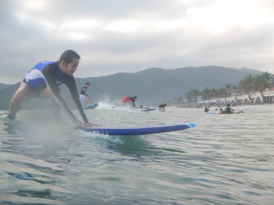 So, you managed to lift yourself and stand on the board! Congratulations! The next goal then is to actually stay on the board and not be annihilated before you can say ‘surf!’ The key to staying on the board is in finding your center, literally. If your weight is on the sides, you drop; on the tail, you fall over; on the nose, you dive. Normally for us beginners, usual stance would be: right (or leg) foot near the tail and left (or right) foot on the center, with body bending a bit forward.